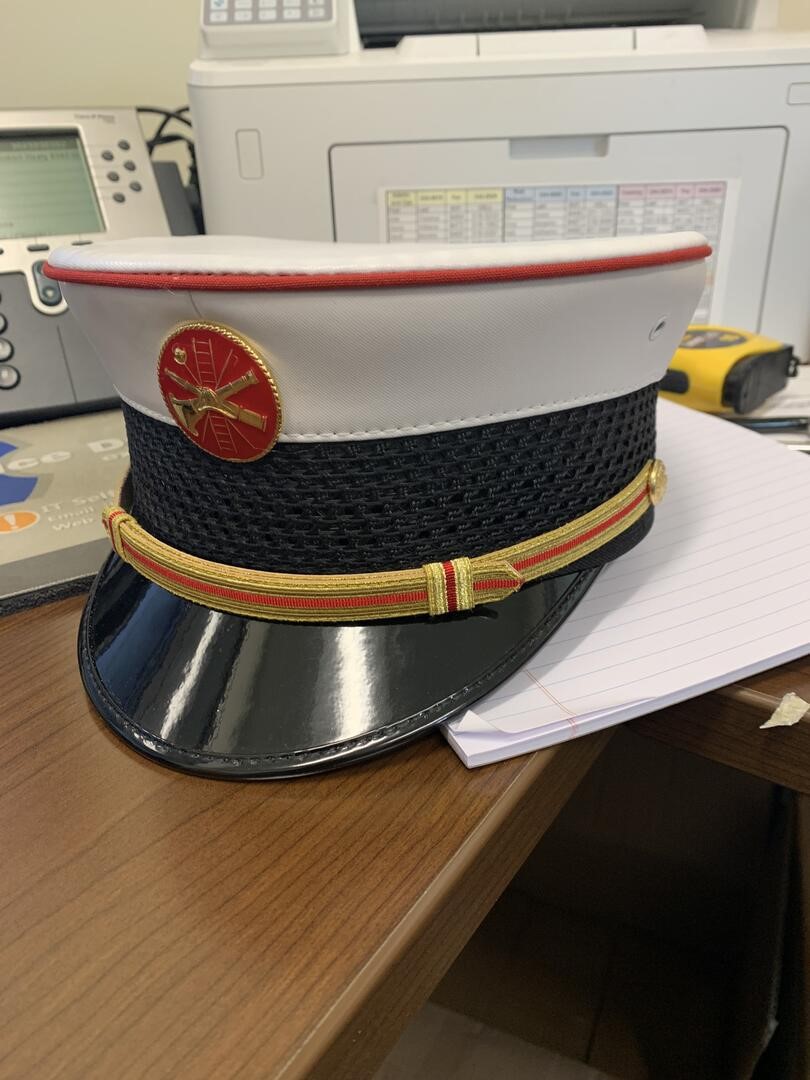 BELL CROWN, WHITE GRAINED, PIPING, RED CLOTH, GOLD STRAP WITH RED INLAY, GOLD FD BUTTONS.