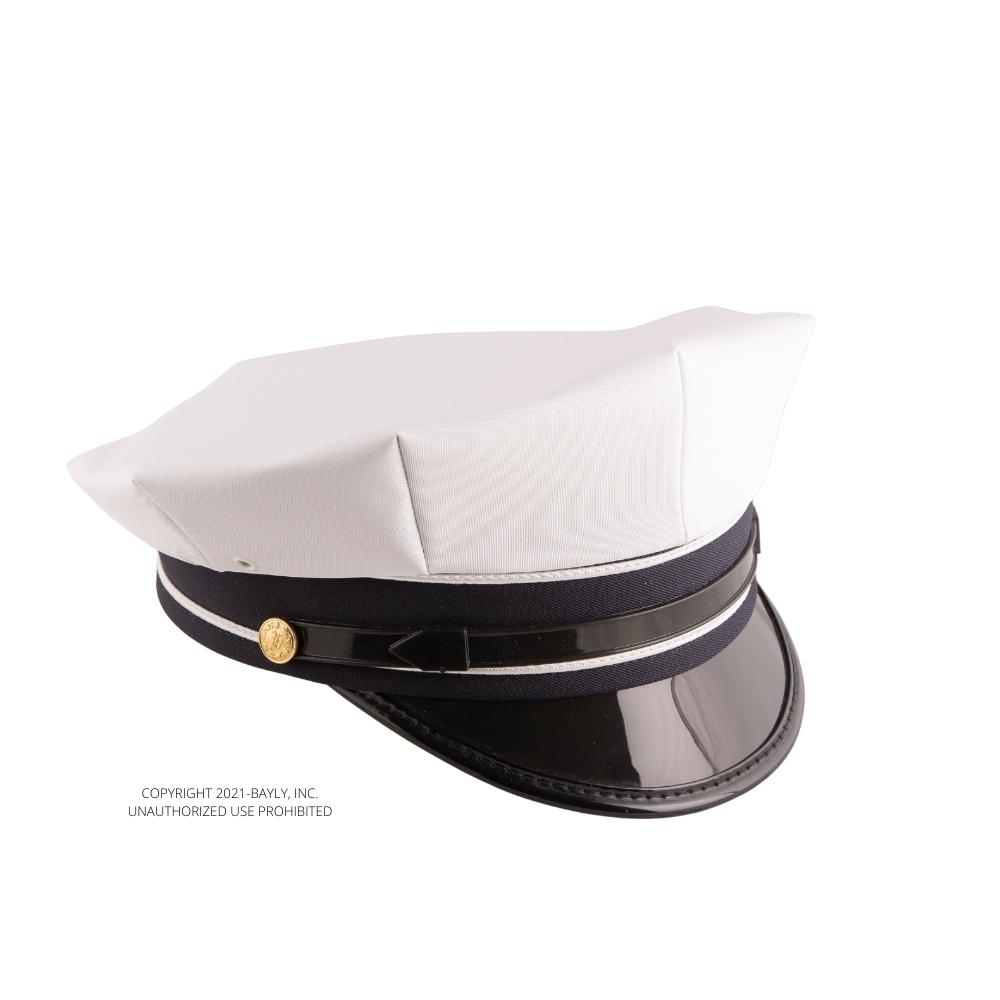8-Point Cap in White Caplite for Traffic Officers consisting of NYPD blue cap band, two rows of White Soutache, Black patent front strap and a Black patent visor.