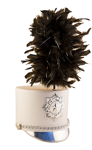 Style No. XC1007 Marching band shako. White grained with american start emblem. Call 1(800) 882-0255 for pricing information.